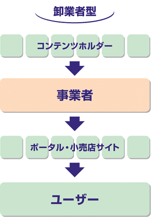 コンテンツ制作者は卸業者を通してより多くの顧客を集めるサイトで楽曲の販売ができ、店舗系小売店型ビジネス事業者は卸業者を通すため自らコンテンツの確保を行う必要がないというメリットがある。