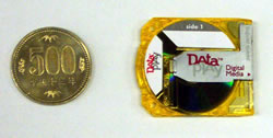データプレイのメディアはこの大きさ(編注:上の写真参照、33.53x39.5x3.05mm)で片面250MB、両面500MBの容量を持ちます。
